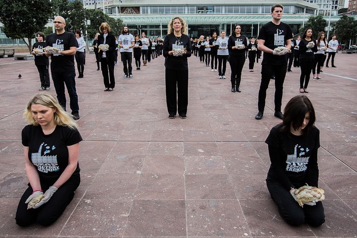 A vigil against factory farming. Credit: Simon Oosterman, http://www.flickr.com/photos/simonoosterman/9531102340/